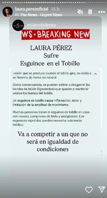 Poco después del accidente, a través de una historia de Instagram, Laura compartió una publicación del perfil de Miami Talents donde confirmaba que había sufrido un esguince en el tobillo, pero que no se retiraría de la competencia, aunque reconocía que competiría en desventaja física.
