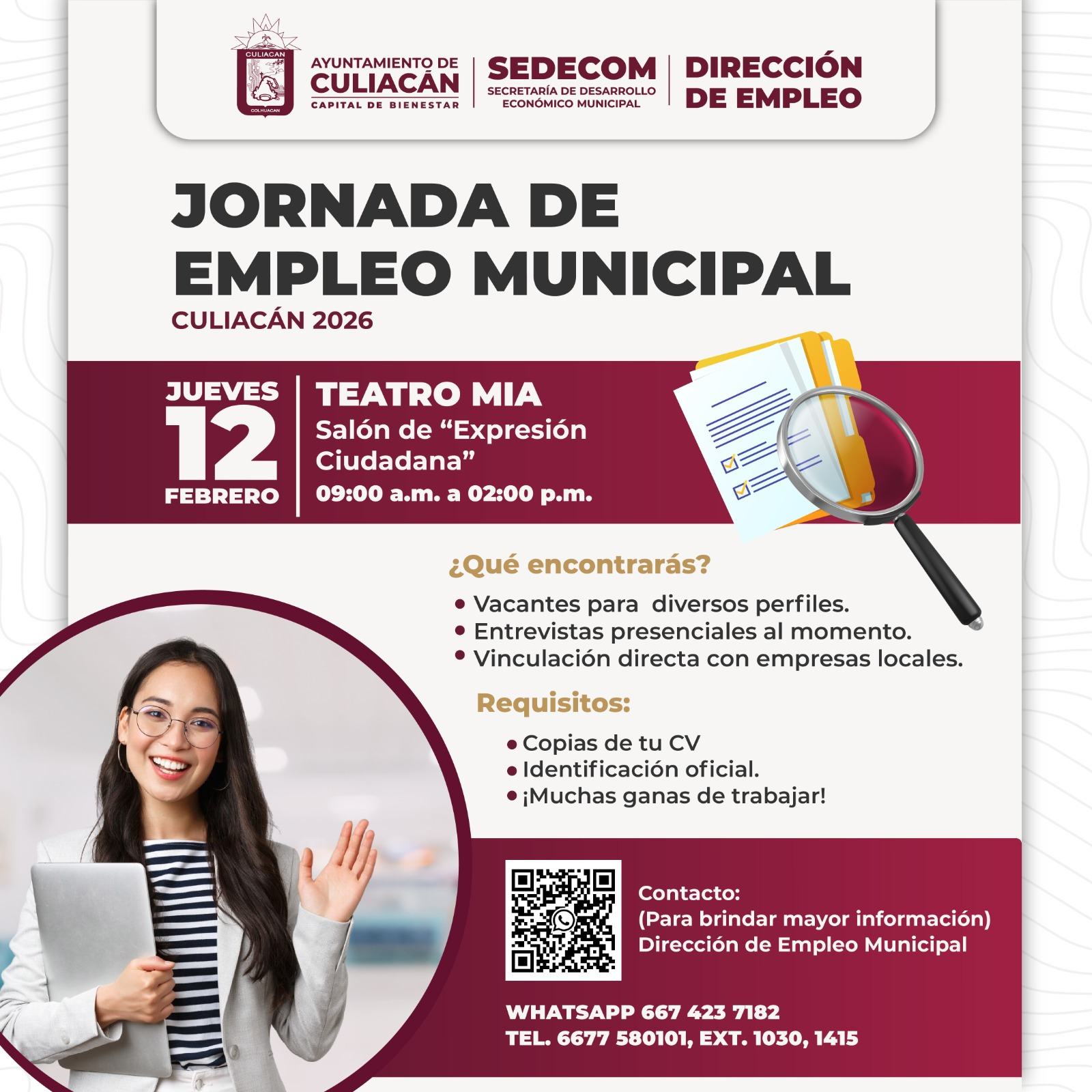 Culiacán, Sinaloa, 09 de febrero de 2026.- El Ayuntamiento de Culiacán, a través de la Secretaría de Desarrollo Económico Municipal, llevará a cabo el segundo evento del año para la promoción de vacantes laborales, con el objetivo de vincular a empresas con personas buscadoras de empleo, fomentando la contratación y fortaleciendo la empleabilidad en el municipio.