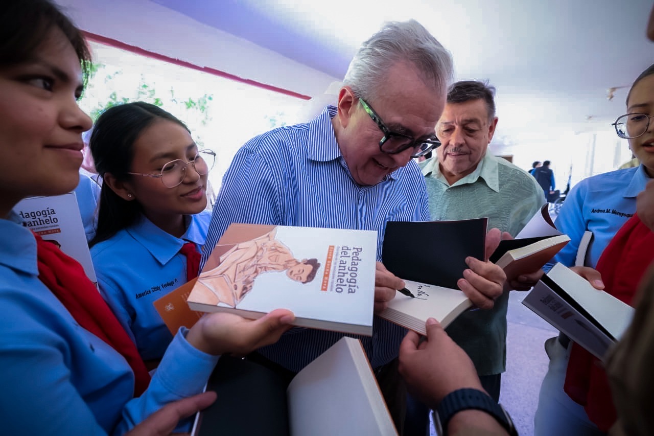 El Quinto, Etchojoa, Sonora 21 de noviembre de 2025.- Fortaleciendo lazos y convivencia generacional con las y los maestros egresados de las escuelas normales de todo el país, para compartir aportaciones y experiencias a través del diálogo y la reflexión, como ex alumno normalista rural, el Dr. Rubén Rocha Moya, asistió como invitado de honor, al V Encuentro Nacional de Egresados y Egresadas de Escuelas Normales Rurales, realizado en su Alma Máter en El Quinto, Etchojoa, Sonora, donde presentó su libro “Pedagogía del Anhelo. Una Vida en las Normales Rurales”.