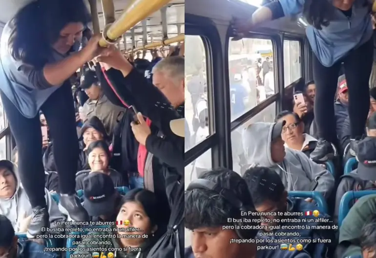 Una cobradora del transporte público en Perú se volvió tendencia en redes sociales tras ser captada cobrando de una manera inusual: caminando sobre los respaldos de los asientos para recoger el dinero de los pasajeros.
