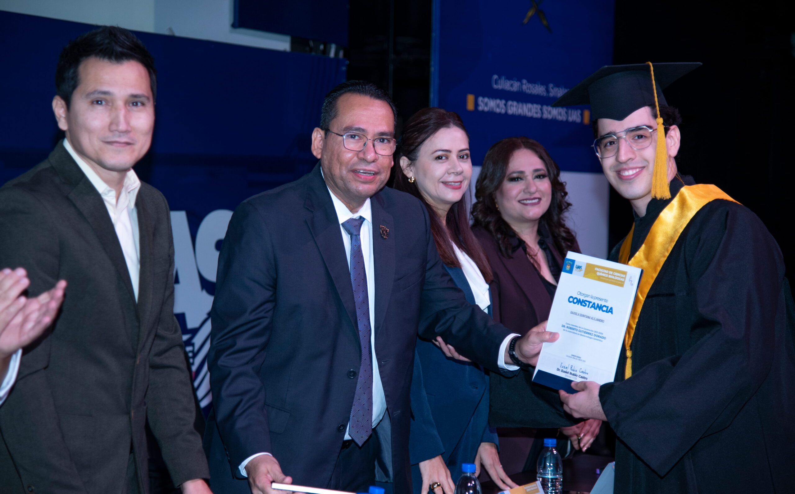 En su intervención, Alejandro Gaxiola Quintana, segundo lugar de aprovechamiento, expresó que el camino no fue fácil, pero que gracias al apoyo de la familia y seres queridos fue posible salir adelante. Incentivó a quienes siguen estudiando a concluir su carrera con pasión para convertirse en verdaderos agentes de cambio.