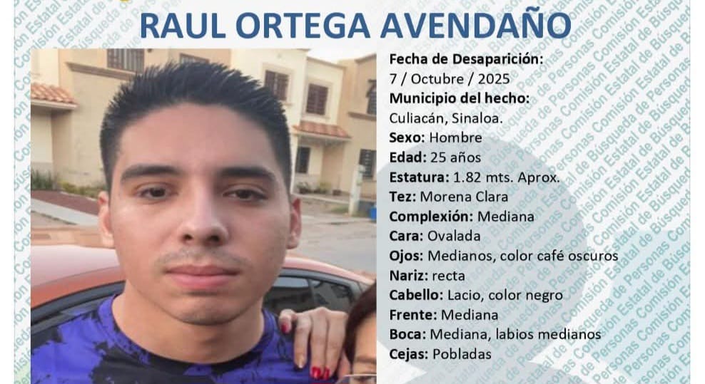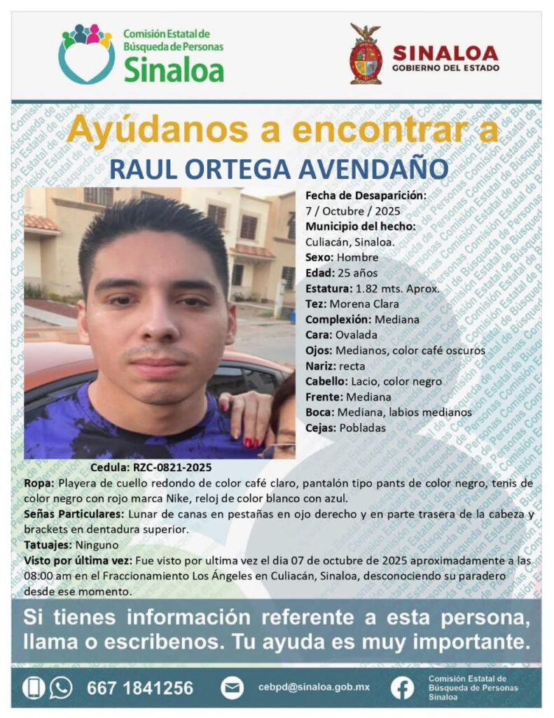 Culiacán, Sin.– La Comisión Estatal de Búsqueda de Personas del Estado de Sinaloa solicita el apoyo de la ciudadanía para localizar a Raúl Ortega Avendaño, de 25 años de edad, quien fue reportado como desaparecido el pasado 7 de octubre de 2025 en el fraccionamiento Los Ángeles, en Culiacán.