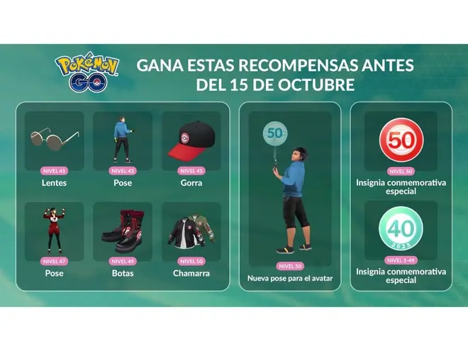 Y, para celebrar el legado de cada entrenador Pokémon GO que actualmente están entre los niveles 1 y 50, a las 23:59 horas (tiempo local) del 14 de octubre recibirán una insignia especial por su nivel; y los que ya estén en el 50, ganarán una nueva chamarra y una pose especial.