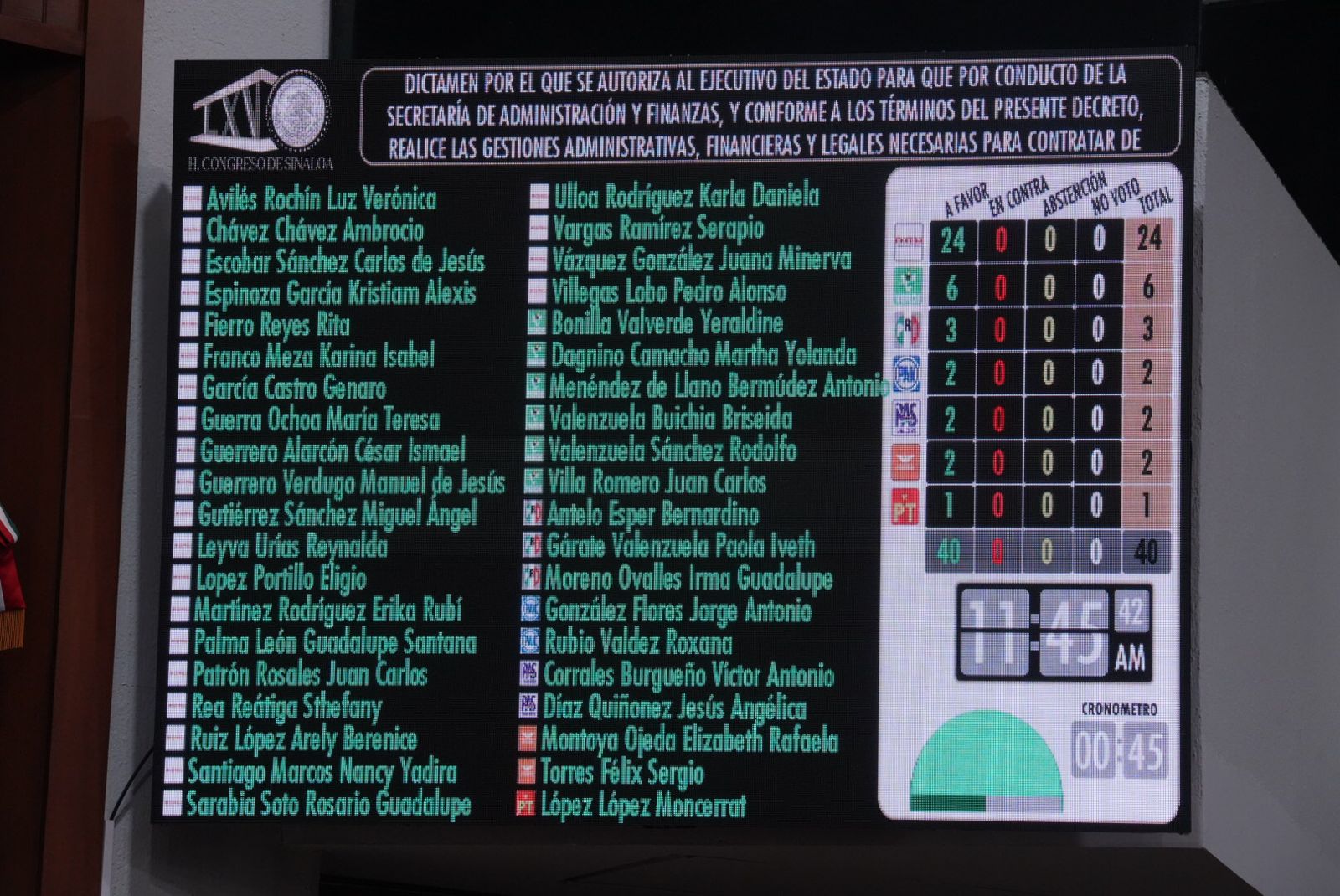 El Decreto, aprobado por todas las diputadas y diputados, autoriza al Estado de Sinaloa, por conducto de sus funcionarios legalmente facultados, para contratar de manera directa con cualquier institución integrante del Sistema Financiero Mexicano que ofrezca las mejores condiciones de mercado, uno o más créditos, hasta por la cantidad de dos mil 300 millones de pesos.