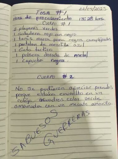 El colectivo Sabuesos Guerreras dio a conocer una lista con las prendas localizadas en dos fosas clandestinas descubiertas recientemente al sur de Culiacán, Sinaloa. En el sitio fueron encontrados restos óseos que corresponderían a aproximadamente 11 personas, según los primeros reportes.