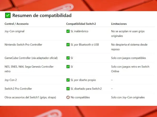 Algunos accesorios del Switch original no son compatibles físicamente con el Switch 2, como el Joy‑Con Grip, cables de carga y soporte de accesorio dedicado.