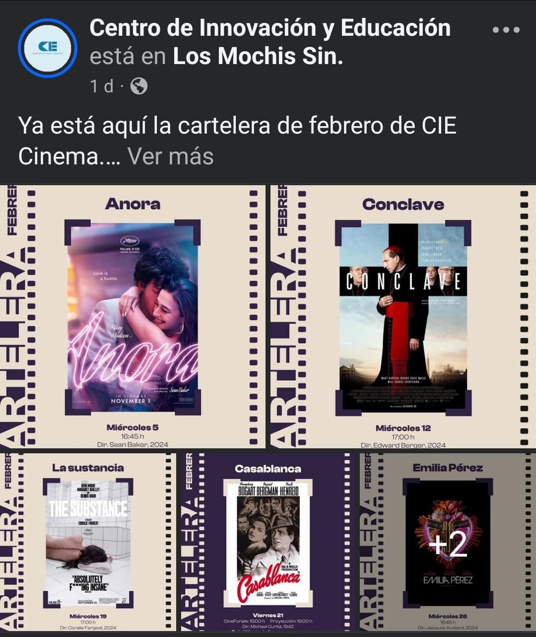 Los Mochis, Sin.– Impulsora de la Cultura de las Artes (IMCA), a través del Centro de Innovación y Educación dan a conocer la cartelera de las ocho películas que se exhibirán en su CIE Cinéma, durante el mes de febrero.