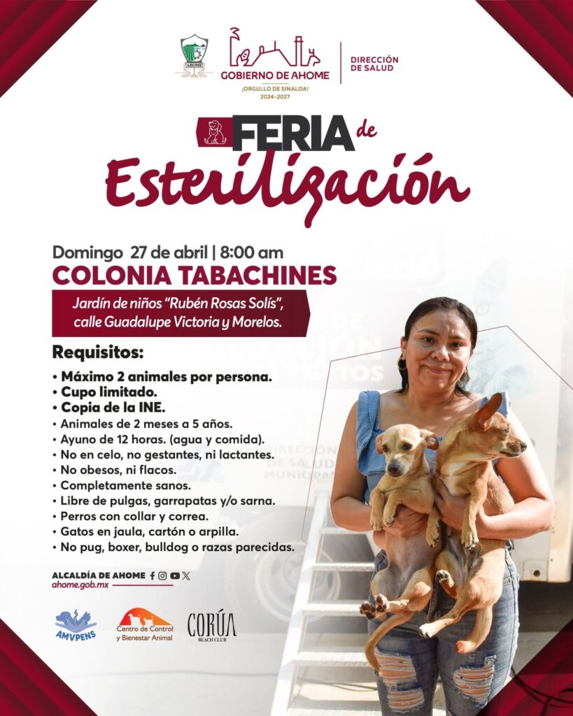 Los Mochis, Sinaloa.- El próximo domingo 27 de abril a partir de las 8:00 de la mañana, la Dirección de Salud del Gobierno de Ahome llevará a cabo una Feria de Esterilización en la colonia Tabachines, específicamente en el jardín de niños “Rubén Rosas Solís”, ubicado en la calle Guadalupe Victoria y Morelos, así lo dio a conocer Rubí Medina Ayala.