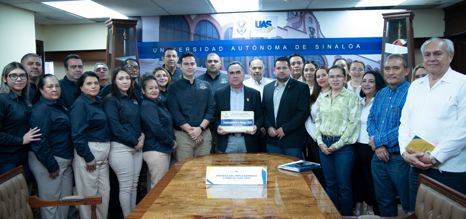 Con el compromiso de atender las demandas planteadas en el pliego petitorio y de cumplir en cuanto se tengan los recursos con prestaciones pendientes como el pago de la parte faltante de la prima vacacional y becas académicas, el Rector de la Universidad Autónoma de Sinaloa (UAS), doctor Jesús Madueña Molina, recibió de parte del SUNTUAS el Emplazamiento a Huelga 2025-2026.
