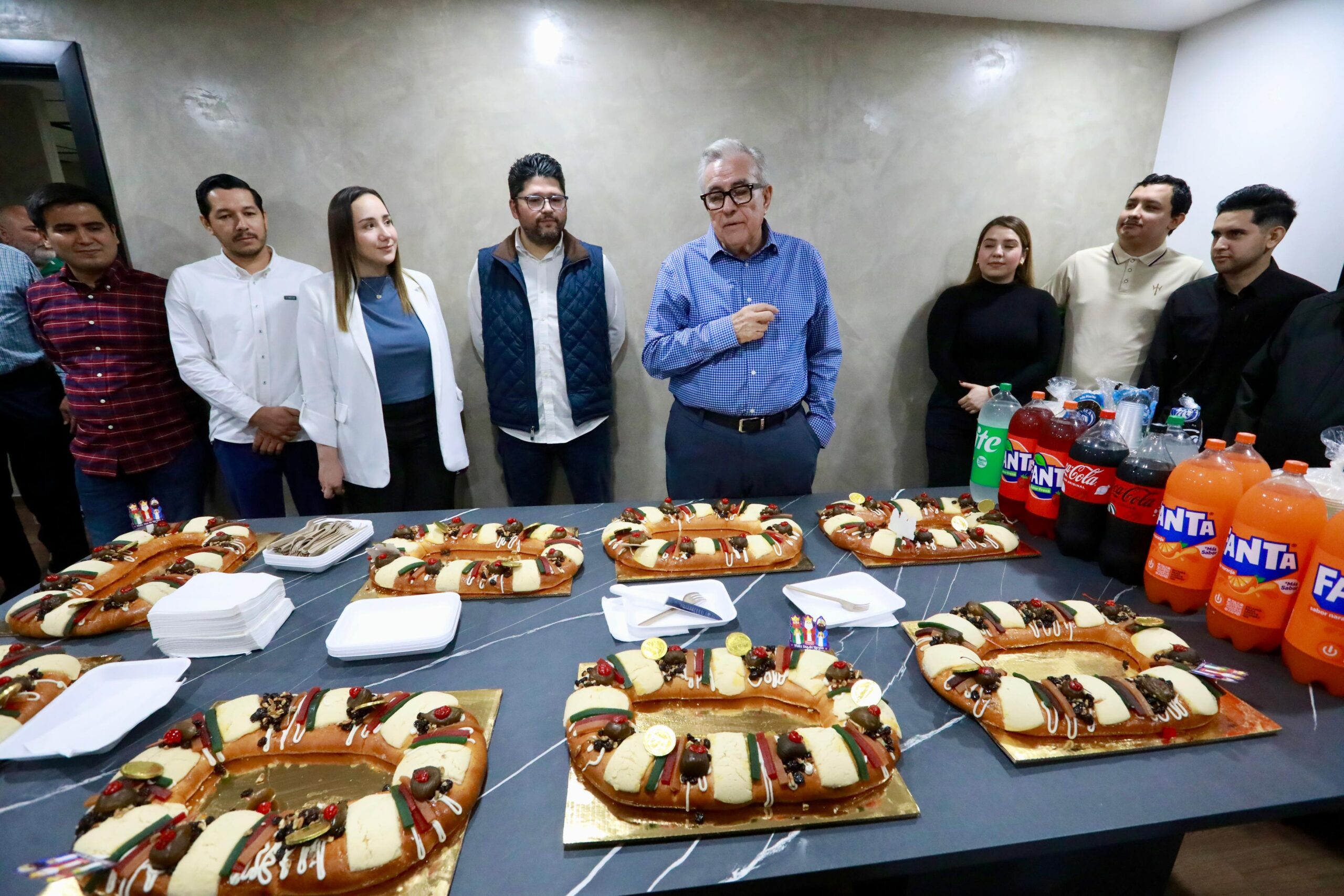 Ya poco después del mediodía, el gobernador Rocha subió al segundo piso, para visitar al personal de la Coordinación de Comunicación Social y Radio Sinaloa, con quienes también compartió la tradicional rosca de reyes, y al partir su pedazo, que le vuelve a tocar el “monito”. “No les digo, qué tino traigo, llevo tres de tres, ya mejor le paro”, y se despidió alegremente.
