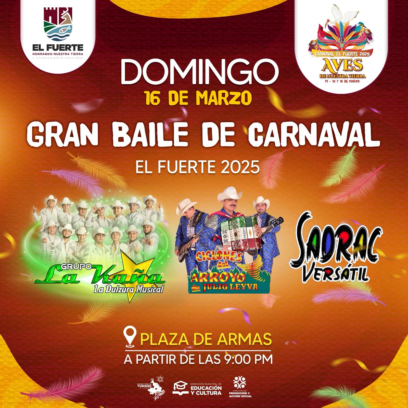 El Carnaval El Fuerte 2025 iniciará el 14 de marzo con el tradicional desfile y coronación del Carnaval Infantil. El día 15 de marzo, los asistentes podrán disfrutar del desfile, la quema del mal humor y la coronación oficial de las reinas, programada para las 20:00 horas, cerrando la noche con un gran baile popular a cargo de Banda LM, a partir de las 21:00 horas.