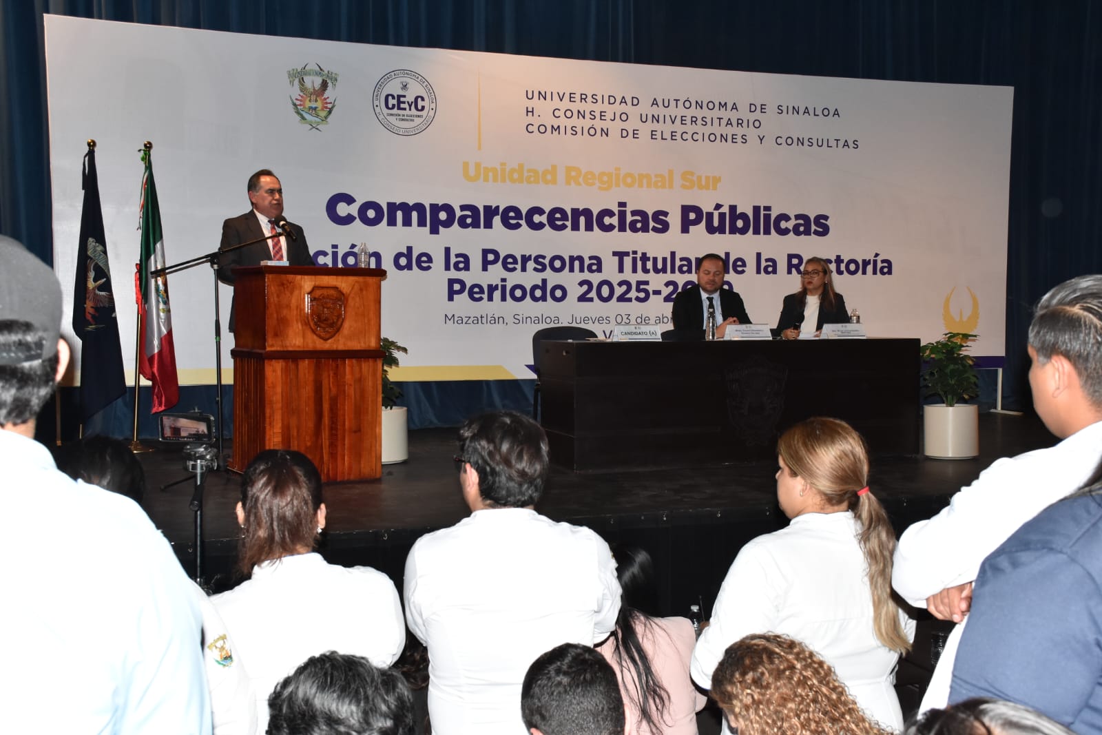 En su segundo día las comparecencias públicas se realizaron en la Unidad Regional Sur (URS) con una gran asistencia donde la comunidad universitaria y público en general pudo conocer las propuestas de las personas aspirantes a la Rectoría de la Universidad Autónoma de Sinaloa (UAS) para el periodo 2025-2029.