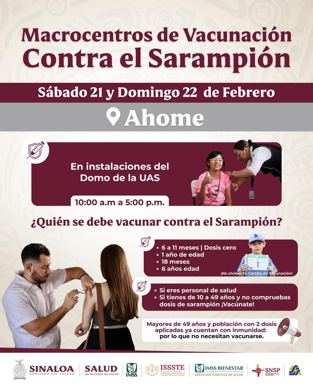 Culiacán, Sinaloa.- La Secretaría de Salud informa a la población que, con el objetivo de fortalecer la protección contra el sarampión, se instalarán macrocentros de vacunación en distintos municipios del estado durante esta semana.