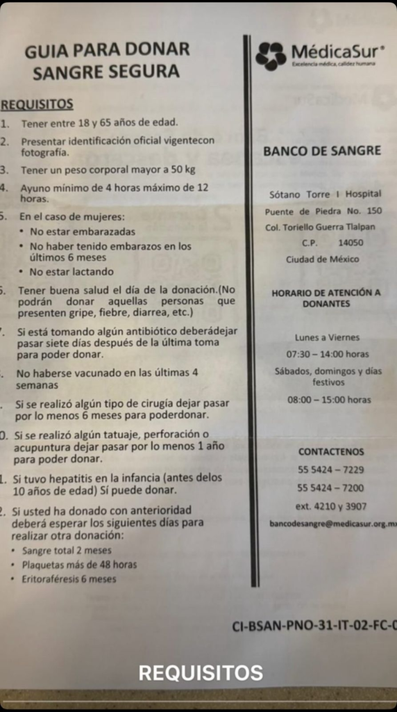 Valentine se encuentra en el hospital Médica Sur, y para quienes deseen donar, los números de contacto disponibles son 55 54 24 72 29 y 55 54 24 72 00, en el horario de 7:30 am a 2:00 pm.