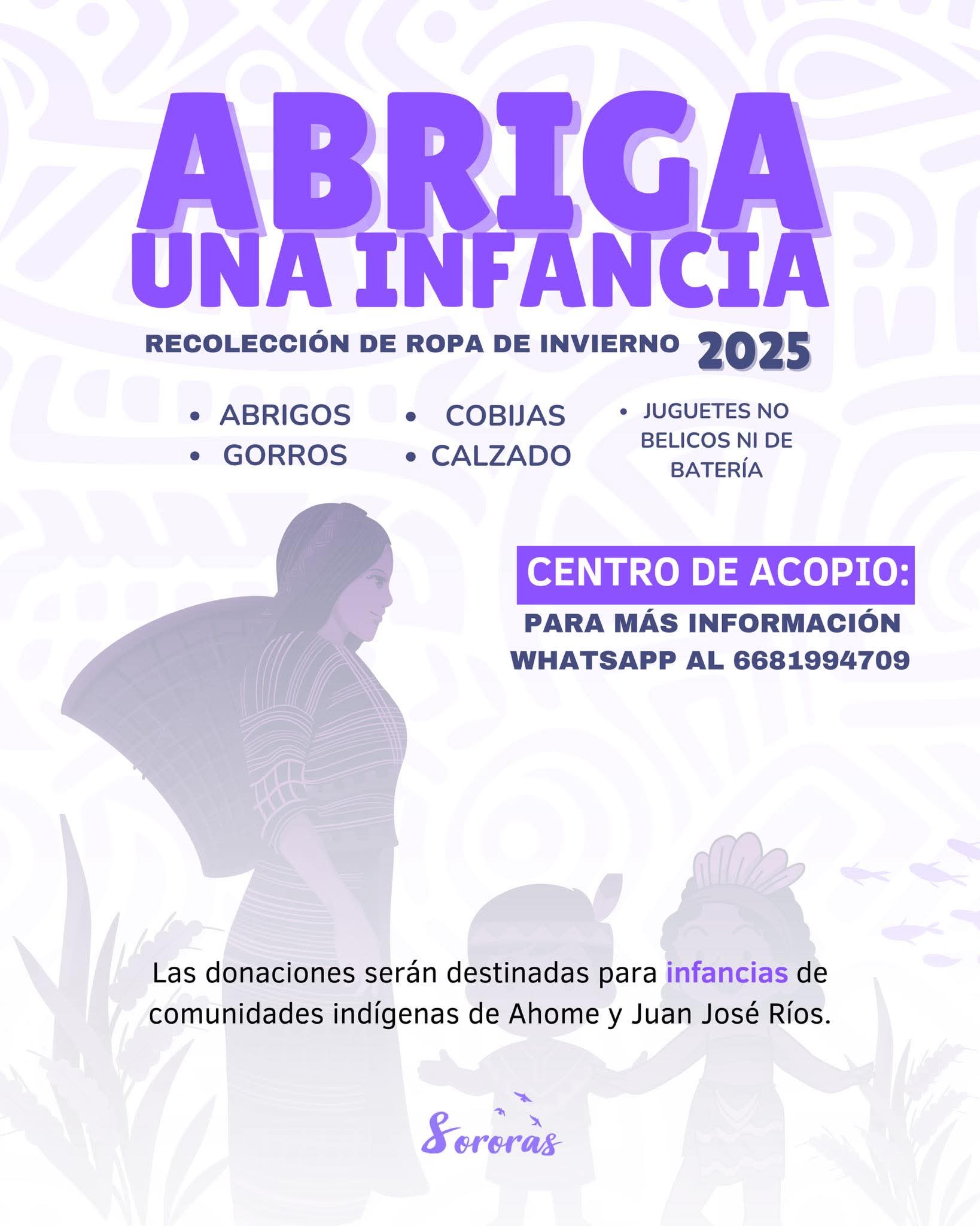 Los Mochis, Sinaloa._ Este invierno, el colectivo Sororas Sinaloa vuelve a tender la mano: lanzando su campaña “Abriga una infancia 2025” para recolectar ropa, calzado y cobijas destinadas a niñas, niños y mujeres en situación de vulnerabilidad.