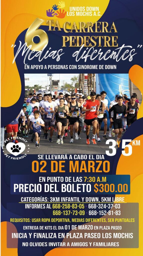 “La fundación Unidos Down Los Mochis, con el aval del Instituto Municipal del Deporte de Ahome y el Comité Municipal de Atletismo, convoca a todos los atletas de la República Mexicana a participar en la sexta edición de la carrera pedestre Medias Diferentes.”
