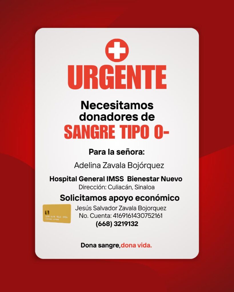 Si usted desea donar sangre o brindar apoyo económico, puede comunicarse directamente con Jesús Zavala al teléfono 668-3219132.