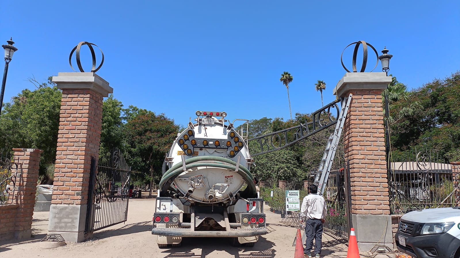 Los Mochis, Sin.- Un incidente se registró este miércoles en el Parque Sinaloa, cuando una unidad que realizaba trabajos de desazolve en el drenaje de los baños impactó el letrero de la entrada por la calle Álvaro Obregón.