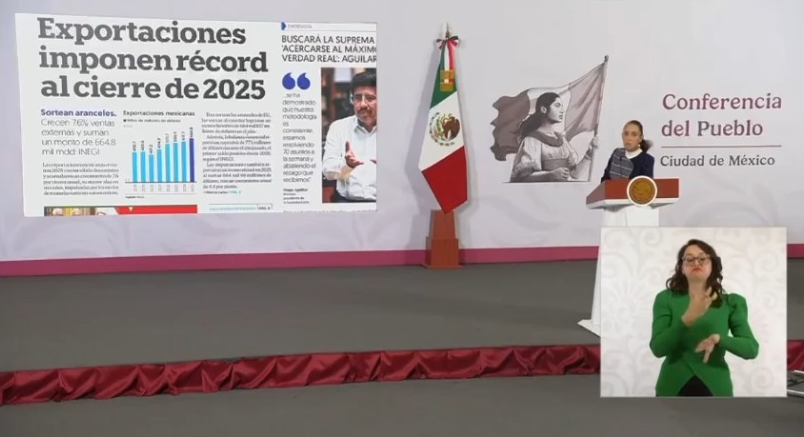 La Presidenta Claudia Sheinbaum Pardo resaltó que el incremento de 7.6 por ciento en las exportaciones totales de 2025 se debe a las ventajas competitivas que tiene México frente a otros países debido a su cercanía con los Estados Unidos, sumado al Tratado entre México, Estados Unidos y Canadá (T-MEC), así como al aumento en las industrias como la electrónica. Además, recordó que la balanza comercial es favorable ya que se exporta más que lo que se importa, lo que es bueno para la economía nacional.